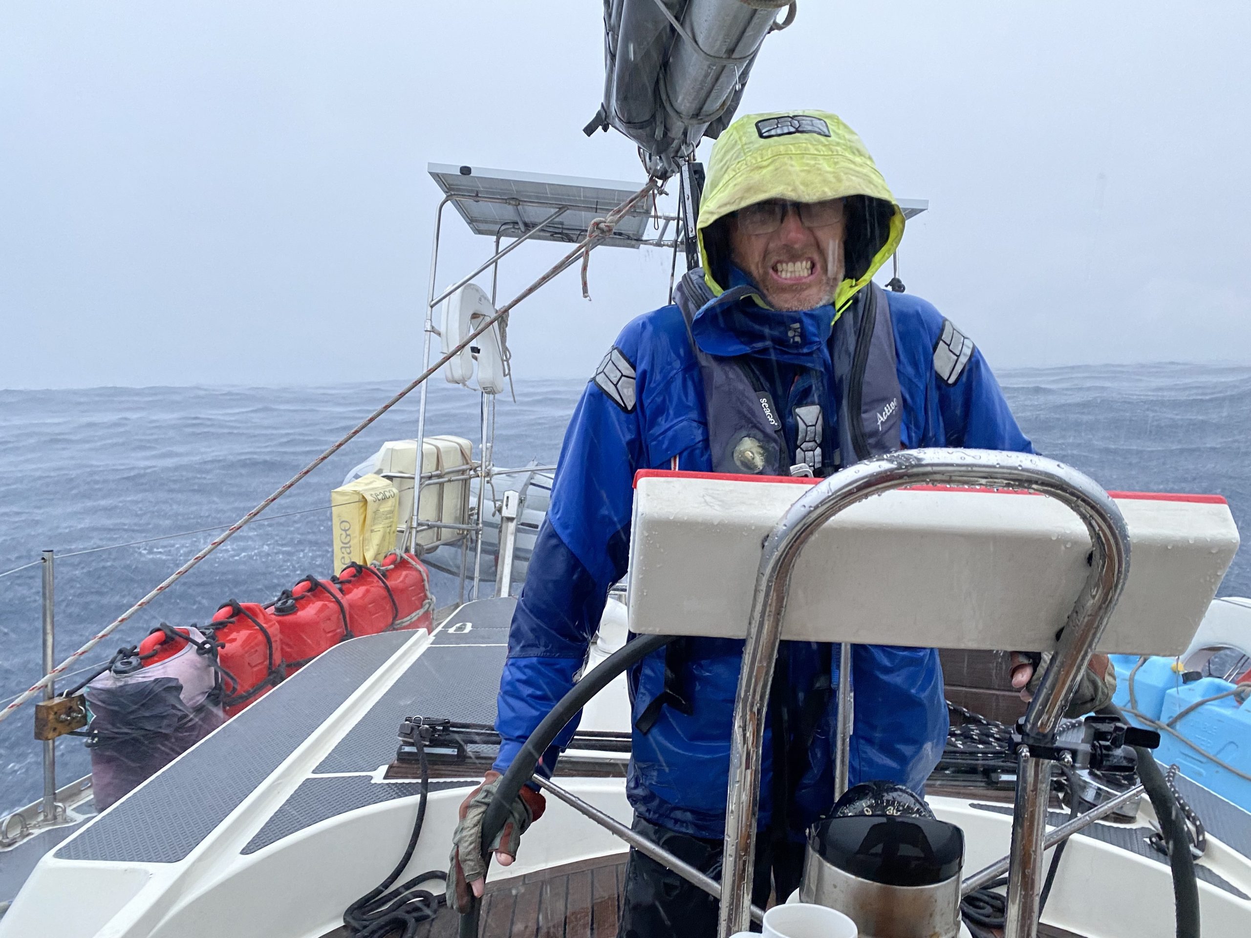 Oh, hang on. Is that a squall coming towards us. Oh crap. Where’s my sunshine gone? Bloody hell that rain is cold. Is my coat leaking? Damn it, now my pants are wet too, and I only put these on yesterday. Christ, I hate living on a boat. I’m so tired, and cold out here in the wilderness. I wish I could make it stop and just live in a house like normal people. What were we ever thinking?