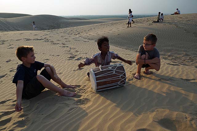 Boy plays a drum in the desert, Jaiselmer, Rajasthan, India
