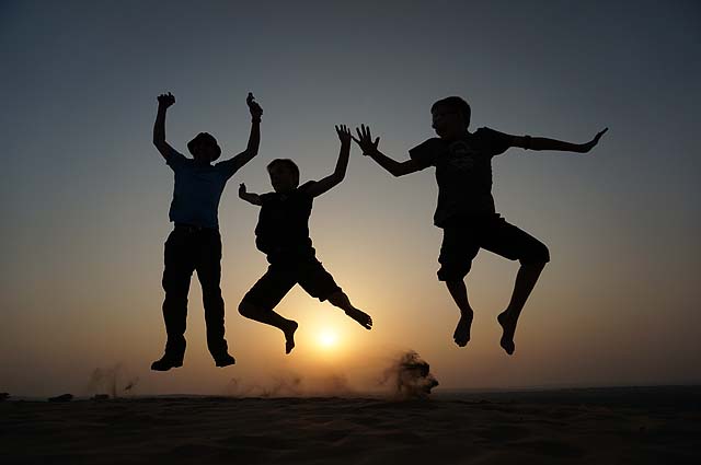 Silhouettes in the desert at sunset, Rajasthan, India